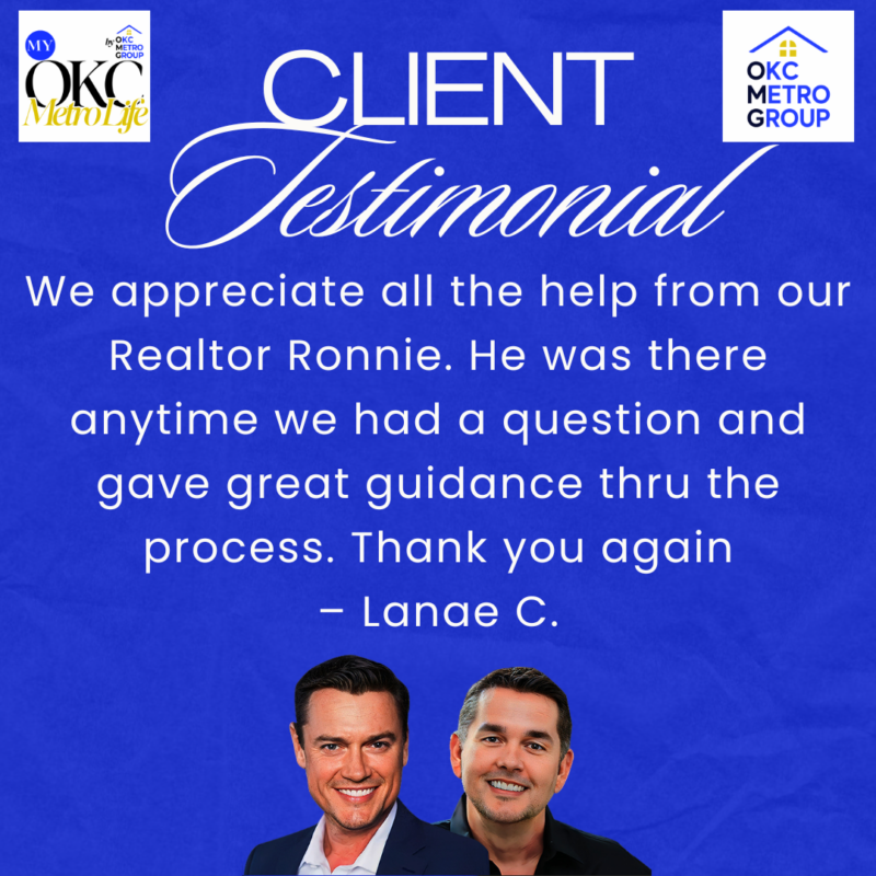 “We appreciate all the help from our Realtor Ronnie. He was there anytime we had a question and gave great guidance thru the process. Thank you again. - LaNae' C”Looking to make a move in the OKC Metro? Give OKC Metro Group a call today at (405) 348-6700! ... Continue Reading » about Client Testimonial