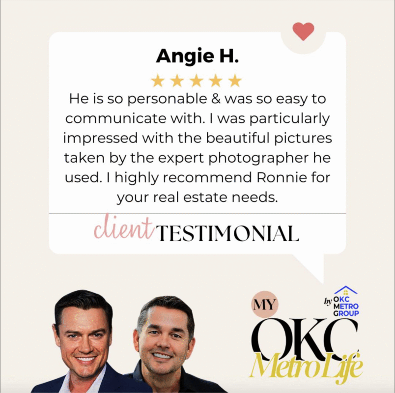 “He is so personable & was so easy to communicate with. I was particularly impressed with the beautiful pictures taken by the expert photographer he used. I highly recommend Ronnie for your real estate needs.” - Angie HLooking to make a move in the OKC Metro? Give us a call today at ... Continue Reading » about Client Testimonial